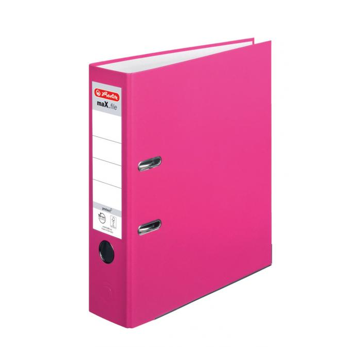 Pákový zakladač maX.file protect A4. Materiál polypropylén, zásuvné vrecko, vnútorný biely podlep, lepenka 2,2mm. Otvor na zadnej strane a radokrúžok pre lepšiu manipuláciu, kovová lišta. Šírka chrbta 8 cm. Farba ružová.