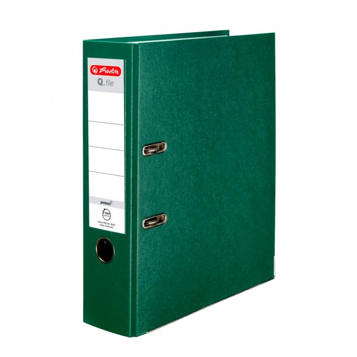 Pákový zakladač Q.file protect formátu A4. Šírka chrbta 8cm. Materiál polypropylén, zásuvné vrecko, vnútorný biely podlep, lepenka 2mm, otvor na zadnej strane a radokrúžok pre lepšiu manipuláciu, kovová lišta. Farba zelená. Väčšie balenie 20 ks.