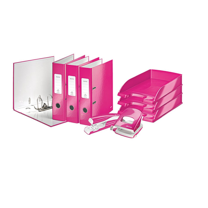 Pákový zakladač rady WOW v žiarivej metalickej ružovej farbe s dvojfarebným efektom. Unikátna patentovaná mechanika Leitz 180° poskytuje širšie otvorenie, možnosť zakladania väčšieho množstva papierov a o 20 % rýchlejšiu prácu so zakladačom. Vybavený chrbtovým krúžkom, rado zámkom a samolepiacim chrbtovým štítkom, ktorý môže byť v prípade potreby odstránený. Šírka chrbta 8 cm, kapacita 600 listov. Väčšie balenie 10 ks.