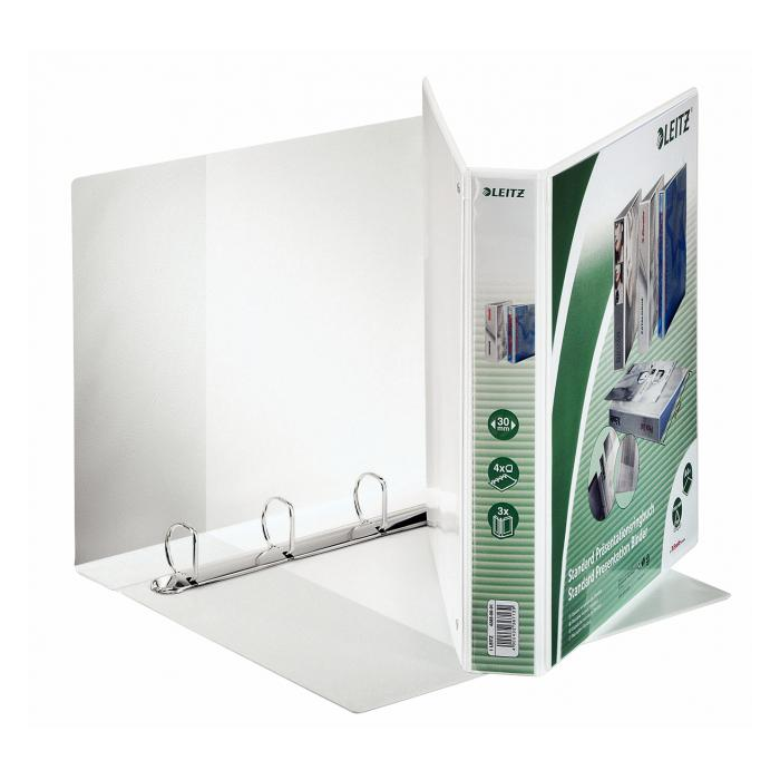 4-krúžkový prezentačný zakladač s transparentným predným, zadným a chrbtovým priehľadným vreckom umožňuje prispôsobiť zakladač svojim potrebám. Vyrobený z polypropylénu (PP), preto je i vodeodolný a nepodlieha klimatickým zmenám na rozdiel od zakladačov vyrobených z PVC. Fólia je prilepená na kartón, preto neprichádza k nepekným bublinám. 4 D-krúžky priemeru 50 mm. Kapacita: 500 listov A4 (80 g/m2). Chrbát 5 cm. Farba biela.