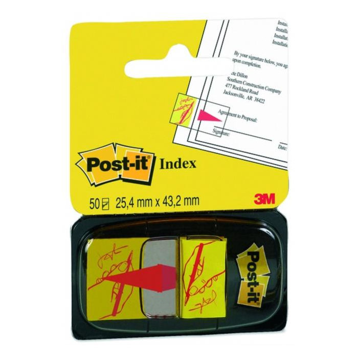 Priehľadná lepiaca časť a farebná časť na označenie. Prelepiteľné,znovunalepiteľné a popisovateľné. Rozmery záložky 25,4 × 43,2 mm. Farba žltá. Počet lístkov: 50.