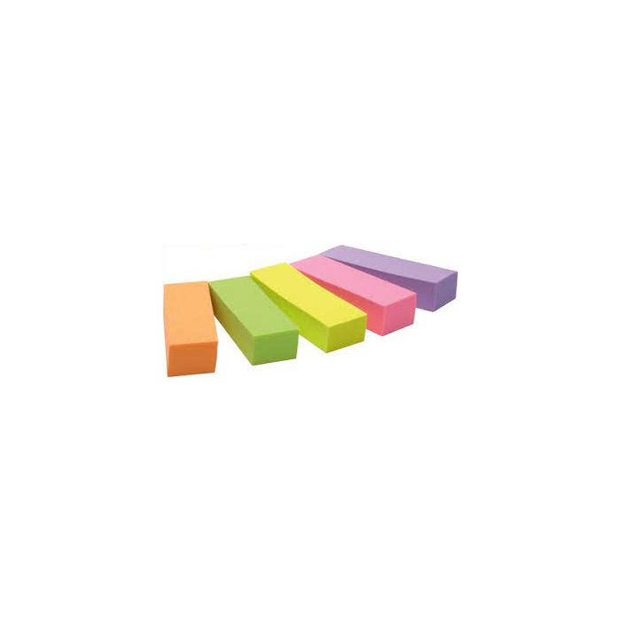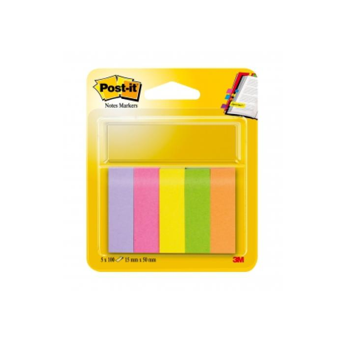 Papierové Post-it záložky bezo zvyšku odlepiteľné zo všetkých povrchov, viacnásobne prelepiteľné, rozmeru 15 × 50 mm. V balení 5 farieb: žltá, oranžová, bledoružová, tmavoružová, zelená po 100 lístkov.
