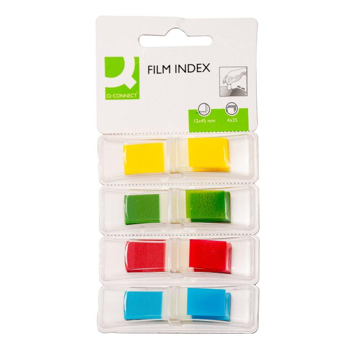Samolepiace fóliové záložky v zásobníku. Prelepiteľné a popisovateľné. Rozmery 12,5 × 43 mm. V balení 4 farby po 36 lístkov. Farba žltá, zelená, oranžová a modrá.