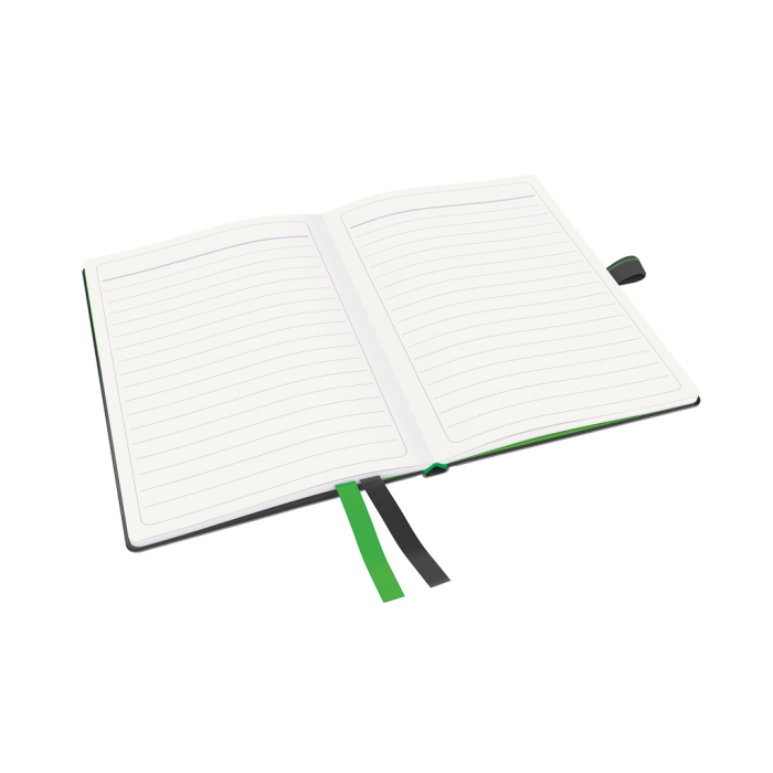 Zápisník s uzatváraním na gumičku s úchytom na pero a 2 textilnými záložkami. Posledných 8 strán perforovaných, samolepiace záložky na zadnej strane na označenie dôležitého obsahu, vnútorný obal s rozšíriteľnou kapacitou na prednej a zadnej strane na uloženie voľných listov. Materiál kožený vzhľad (syntetická koža). Formát A6.