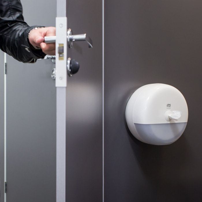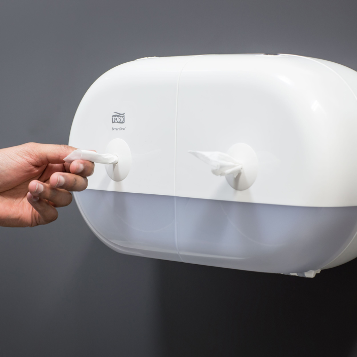 Tork SmartOne® mini zásobník na toaletný papier v dizajne Elevation je moderný a efektívny systém zásobníkov vhodný pre toalety a umyvárne s nízkou až strednou návštevnosťou, kde je požadovaná vyššia odolnosť. Dávkovanie po útržkoch pomáha znižovať spotrebu až o 40 % v porovnaní s tradičnými jumbo kotúčovými zásobníkmi, čo znamená viac návštev na jeden kotúč. Zásobníky Tork Elevation majú praktický a moderný dizajn, ktorý zanecháva v hosťoch dlhodobý dojem.