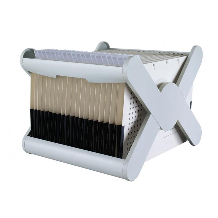 Zásobník redukovaného tvaru, ale so zachovaním plnej funkcionality. Stohovateľný, veľmi kompaktný, vhodný na závesné obaly A4 s ľahkým prístupom k používaným súborom. Kapacita uchovávania až 35 závesných obalov typu V. Rozmery (š × v × h) 359 × 269 × 320 mm. Farba sivá.