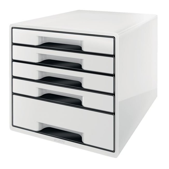 Box, dopĺňajúci produktovú radu Leitz WOW. Ľahko vysúvateľné 4 malé a 1 veľká zásuvka so zarážkou proti úplnému vysunutiu, jednoduché otváranie a zatváranie. Gumové nožičky pre lepšiu stabilitu, rozlišovač na popis zásuvky. Rozmery 287 × 270 × 363 mm. Farba čierna.
