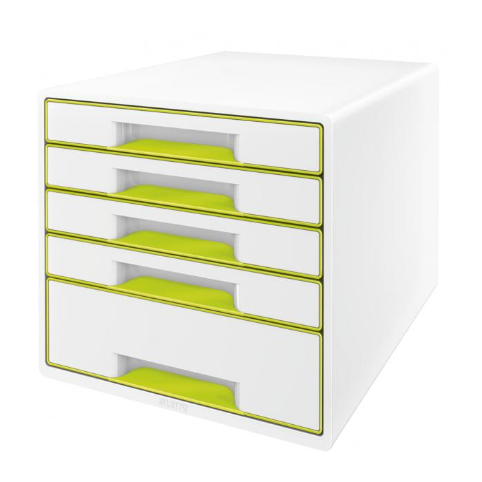 Box, dopĺňajúci produktovú radu Leitz WOW. Ľahko vysúvateľné 4 malé a 1 veľká zásuvka so zarážkou proti úplnému vysunutiu, jednoduché otváranie a zatváranie. Gumové nožičky pre lepšiu stabilitu, rozlišovač na popis zásuvky. Rozmery 287 × 270 × 363 mm.