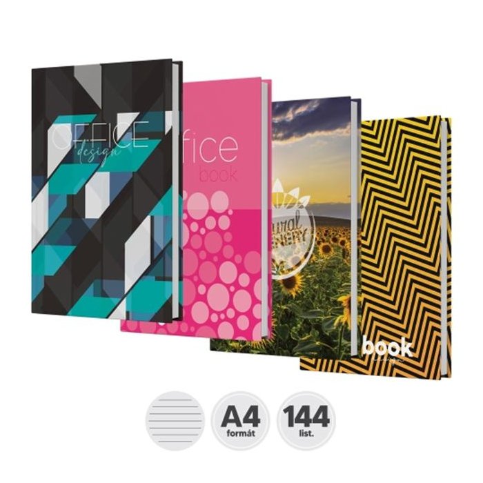 Záznamové knihy A4 sú vyrobené z bezdrevného písacieho papiera. Obálka je vyrobená z tvrdého kartóna, ktorý je potlačený rôznymi farebnými motívmi a potiahnutý laminom. Linajková - 144 listov.