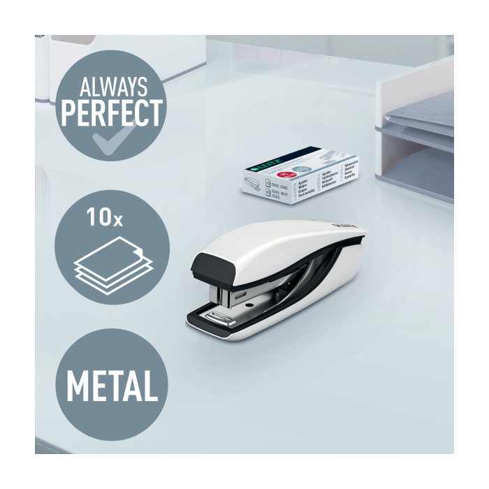 Malá zošívačka v moderných žiarivých farbách ideálna nielen do kancelárie, ale aj domov alebo na cesty. Vždy perfektné zošitie vďaka patentovanej technológii DIT. V kombinácii so spinkami  Leitz Power Performance P2 (č. 10) dosiahnete vždy jednoduché a správne zošitie.Kapacita 10 hárkov. Vrecková zošívačka. Patentovaná technológia DIT na spoľahlivé zošívanie. Balenie v škatuľke, vrátane spiniek. Otvorením ramena o 180° je možné použiť nástenkové zošívanie (takrovanie). Farba biela.
