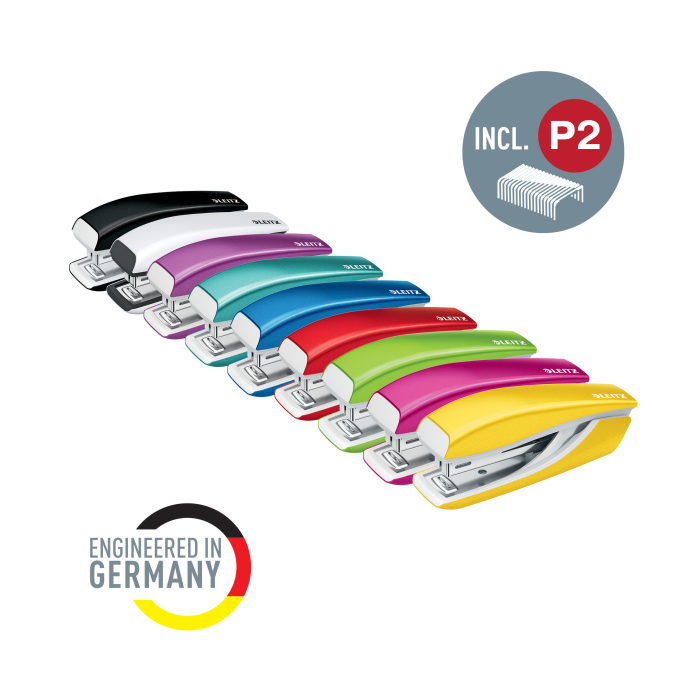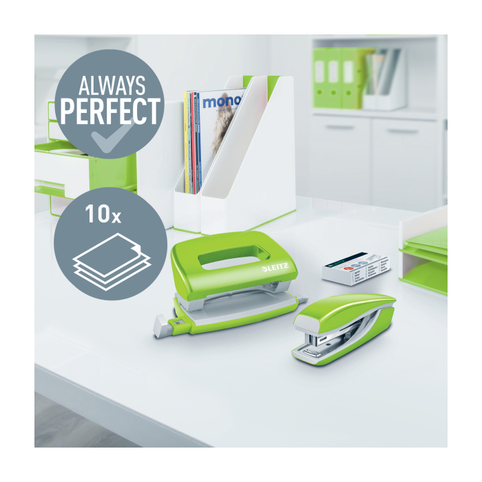 Malá zošívačka v moderných žiarivých farbách ideálna nielen do kancelárie, ale aj domov alebo na cesty. Vždy perfektné zošitie vďaka patentovanej technológii DIT. V kombinácii so spinkami Leitz Power Performance P2 (č. 10) dosiahnete vždy jednoduché a správne zošitie.Kapacita 10 hárkov. Vrecková zošívačka. Patentovaná technológia DIT na spoľahlivé zošívanie. Balenie v škatuľke, vrátane spiniek. Otvorením ramena o 180° je možné použiť nástenkové zošívanie (takrovanie). Farba zelená.