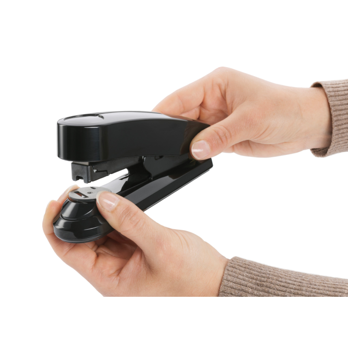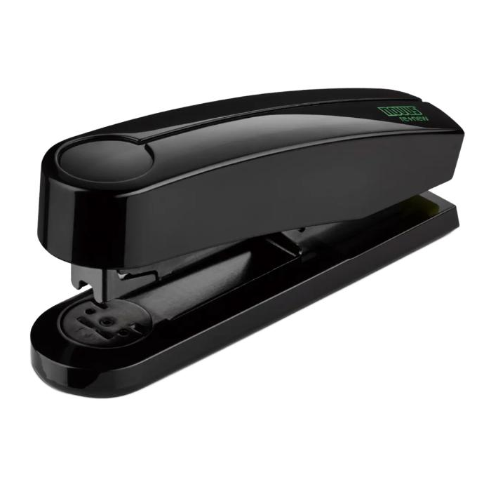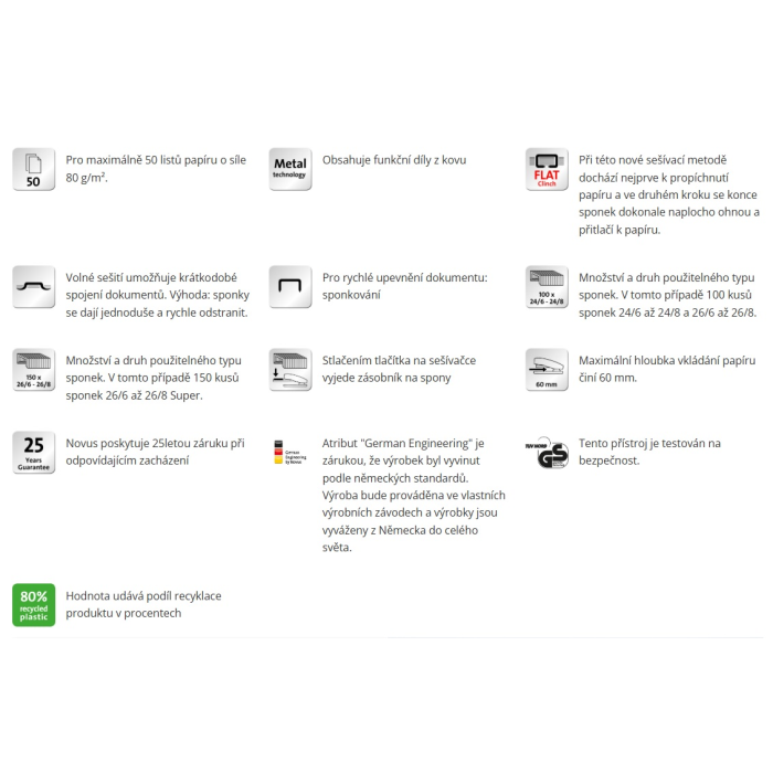 Celokovová kancelárska zošívačka pre každodenné profesionálne použitie z kolekcie šetrnej k životnému prostrediu re+new, s lesklým plášťom z 81% recyklovaného plastu. Dvojité vedenie spiniek, kapacita náplne 100 spiniek 24 / 6 - 8 alebo 150 spiniek 26 / 6 - 8. Hĺbka zošívania 6,5 cm. Hmotnosť 245 g. Záruka 25 rokov. Súčasťou balenia je 200 spiniek 24 / 6 DIN SUPER. Kapacita 40 listov. Farba čierna.