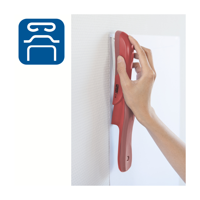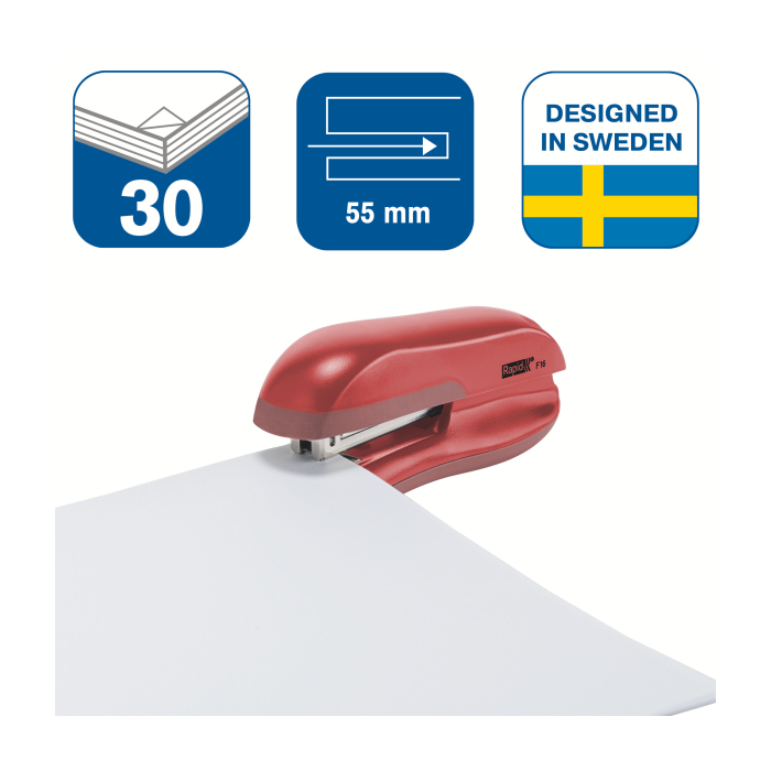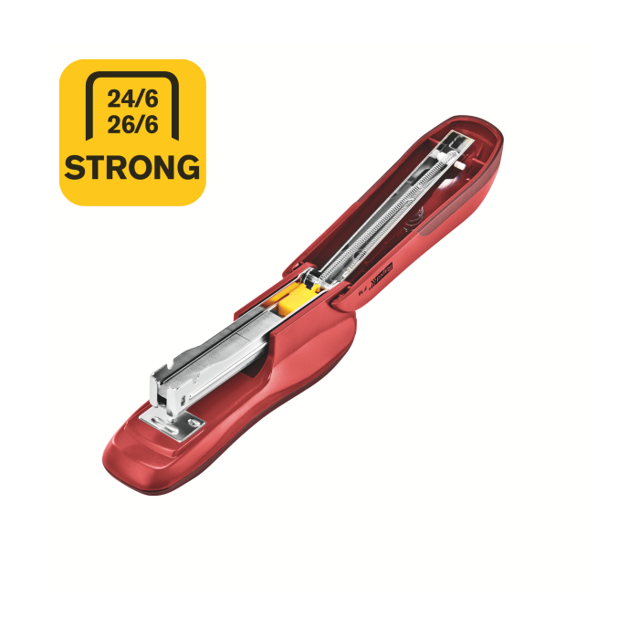 Zošívačka s polovičným plnením spiniek, oceľovým mechanizmom, kvalitným plastom ABS a gumou TPE. Módny ergonomický dizajn. Vhodná pre domácnosť aj kanceláriu. Zošije až 30 listov papiera (80 gsm). Farba červená.
