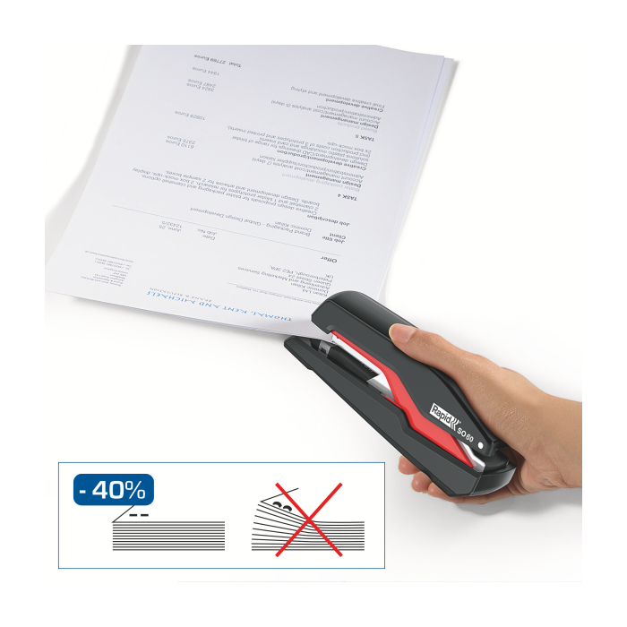 Revolučná zošívačka kompaktných rozmerov a s klasickou kapacitou zásobníka, vybavená patentovanou technológiou Omnipress®, ktorá umožňuje s minimom sily stlačiť zošívačku po celom jej tele a ľahko tak zošiť dokument na stole i v ruke. To všetko v kombinácii s technológiou super plochého zošívania SuperFlatClinch prinášajúcou 40 % úsporu miesta pri zakladaní takto zošitých dokumentov. Farba čierna/červená.