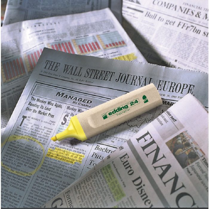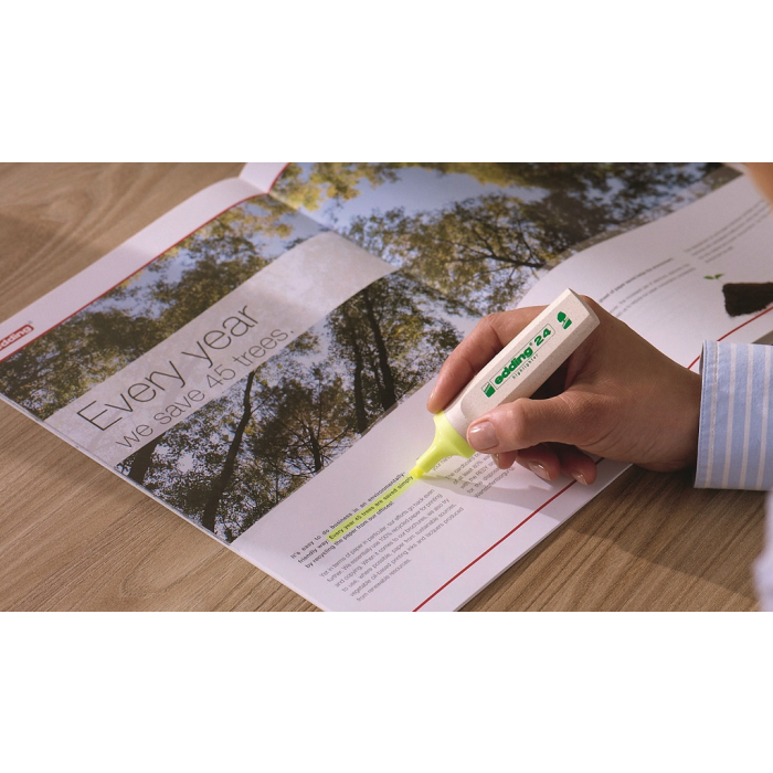 Minimálne 90% tela a uzáveru zvýrazňovača vyrobené z obnoviteľných zdrojov. Zvýrazňovač so zrezaným hrotom so šírkou stopy 2 - 5 mm. Pre zvýraznenie textových pasáží, poznámok a pod. Atrament na vodnej báze s intenzívnymi farbami. Dopĺňateľný atramentom HTK 25. Balenie 10 ks. Farba: žltá