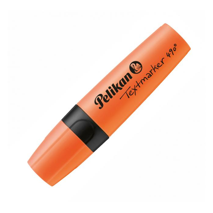 Zvýrazňovač Pelikan 490 osadený klinovým hrotom so šírkou stopy 1 - 5 mm. Plnený atramentom na vodnej báze, vhodným na všetky druhy papierov, odolný voči vysychaniu. Balenie v krabičke. Farba oranžová.